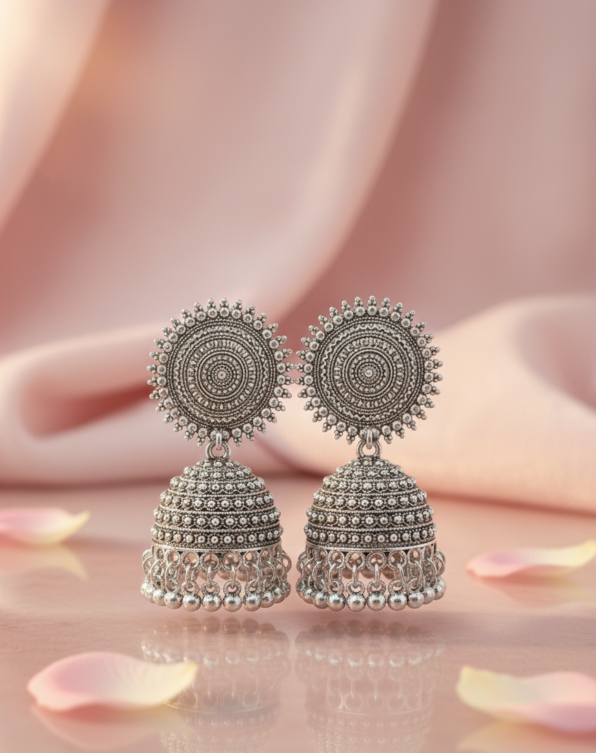 - Authentic Design: Features a large, intricately carved circular stud and a classic dome-shaped jhumka.